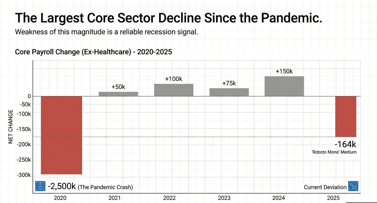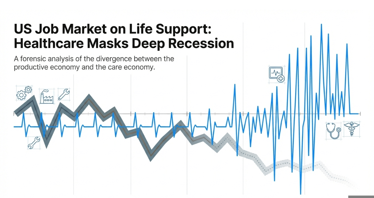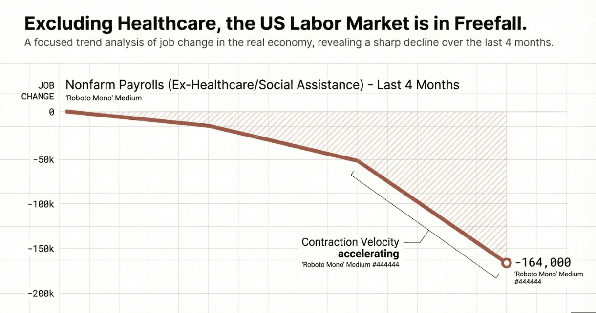 Dane główne sugerują, że rynku pracy w USA jest ugięty, ale nie złamany. Jednak spojrzenie głębiej odkrywa znacznie ciemniejszą rzeczywistość: gospodarka produkcyjna już się kurczy, a jedynym czynnikiem utrzymującym rynek pracy na powierzchni jest ogromny, niecykliczny boom w sektorze opieki zdrowotnej. Gdy usuniemy tę jedną gałąź, rynek pracy w USA nie tylko się ochładza, ale znajduje się w głębokim spadku recesyjnym.