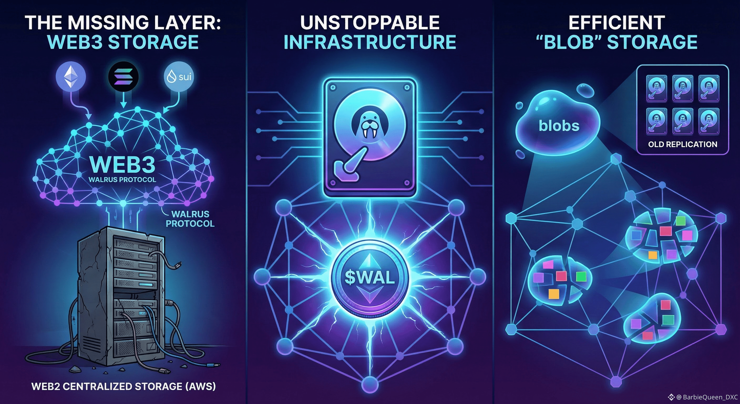 A futuristic digital illustration showing a glowing, decentralized network structure acting as a foundation. Below, a stylized, old-fashioned server rack labeled "WEB2 CENTRALIZED STORAGE" is crumbling and disconnected. Above it, a sleek, interconnected mesh network of nodes forming a massive data cloud is labeled "WEB3 WALRUS PROTOCOL." Data streams flow from various blockchain logos (Ethereum, Solana, Sui) into the Walrus cloud. A prominent glowing coin with the "$WAL" symbol is at the center of the Walrus network. The overall color palette is deep blues, purples, and neon cyan.
