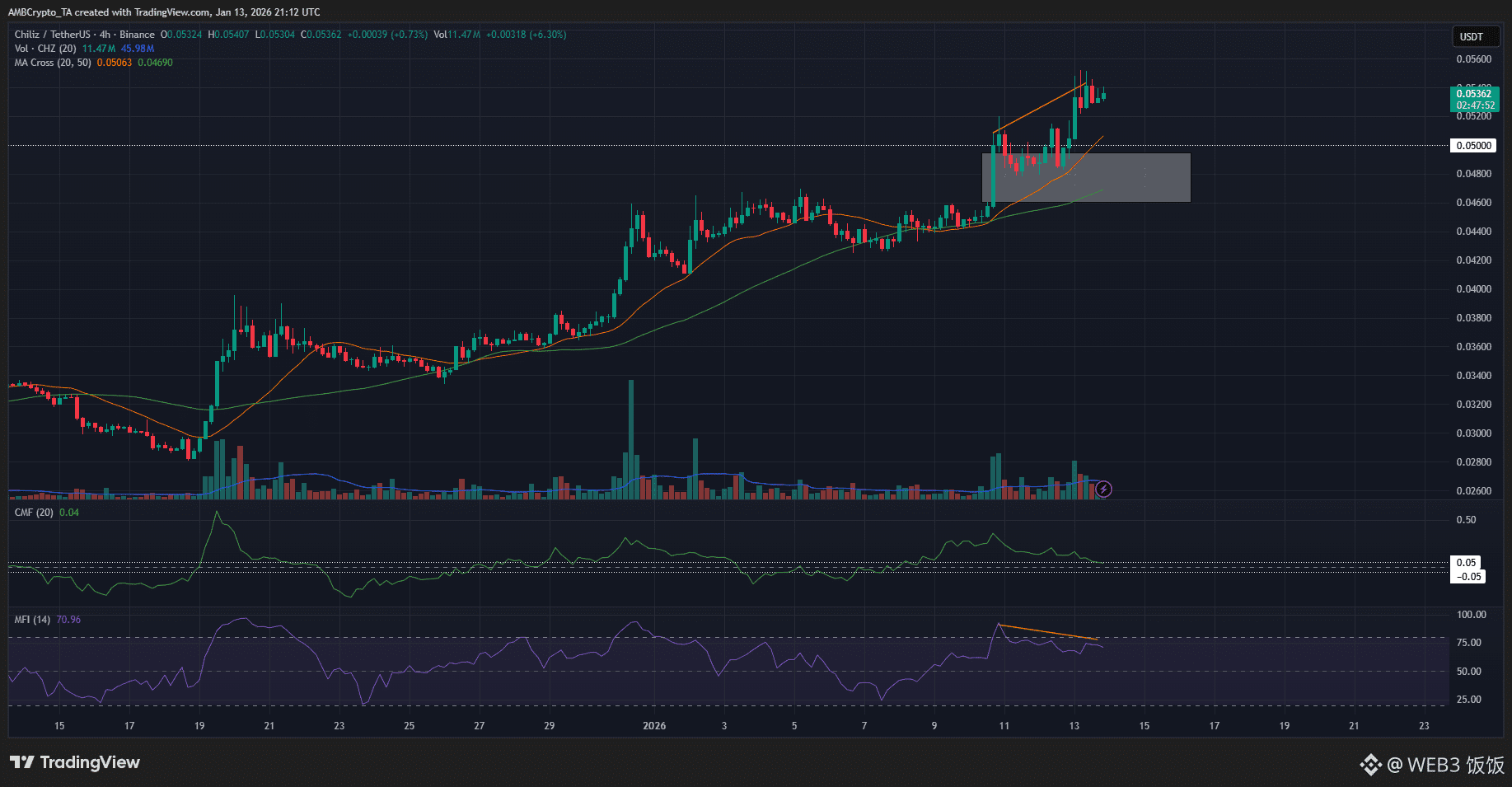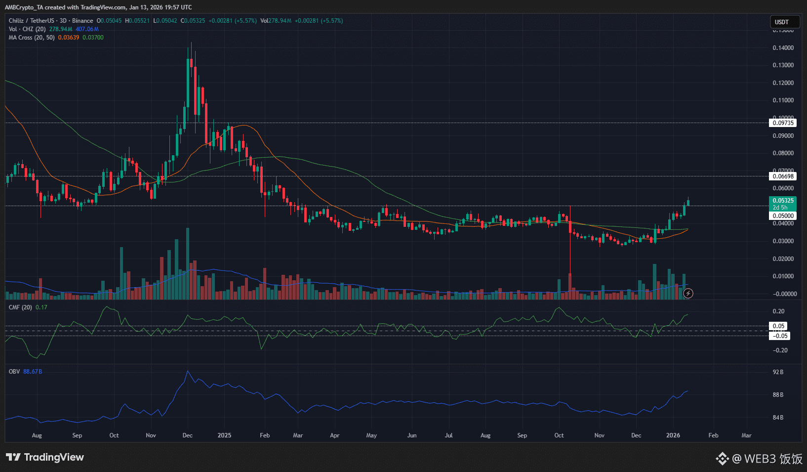 近几周,CHZ 多头取得了明显进展。三天图显示,0.05美元这一长期阻力位终于被稳稳掌控,这在2025年的大部分时间里都是一个难以突破的价格关卡。