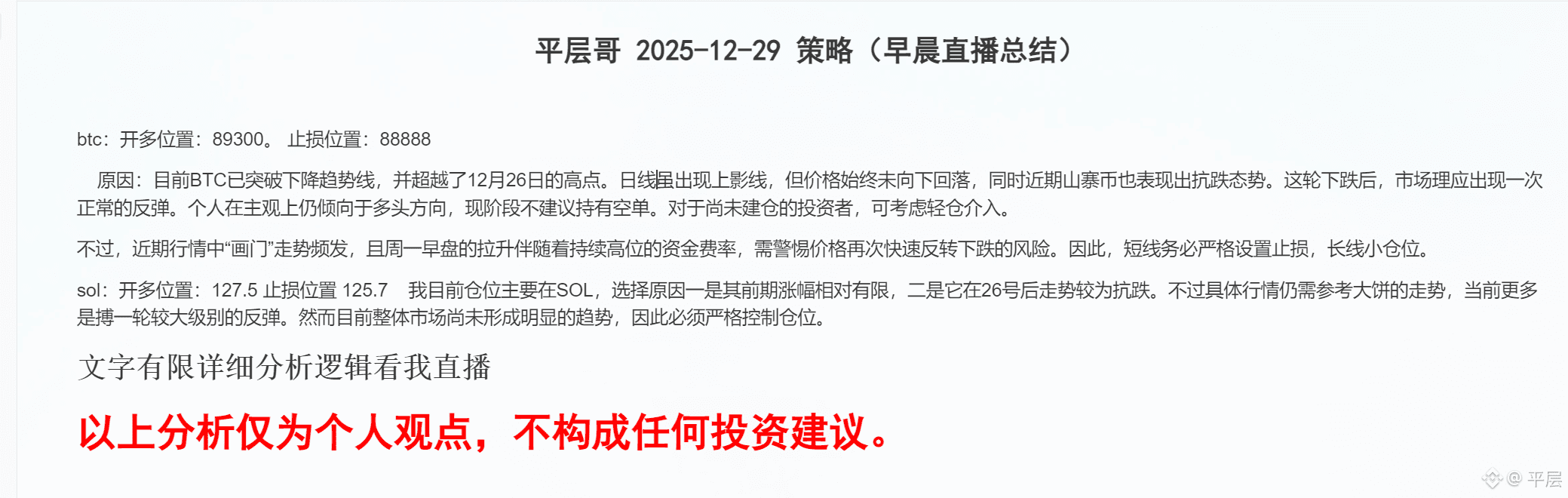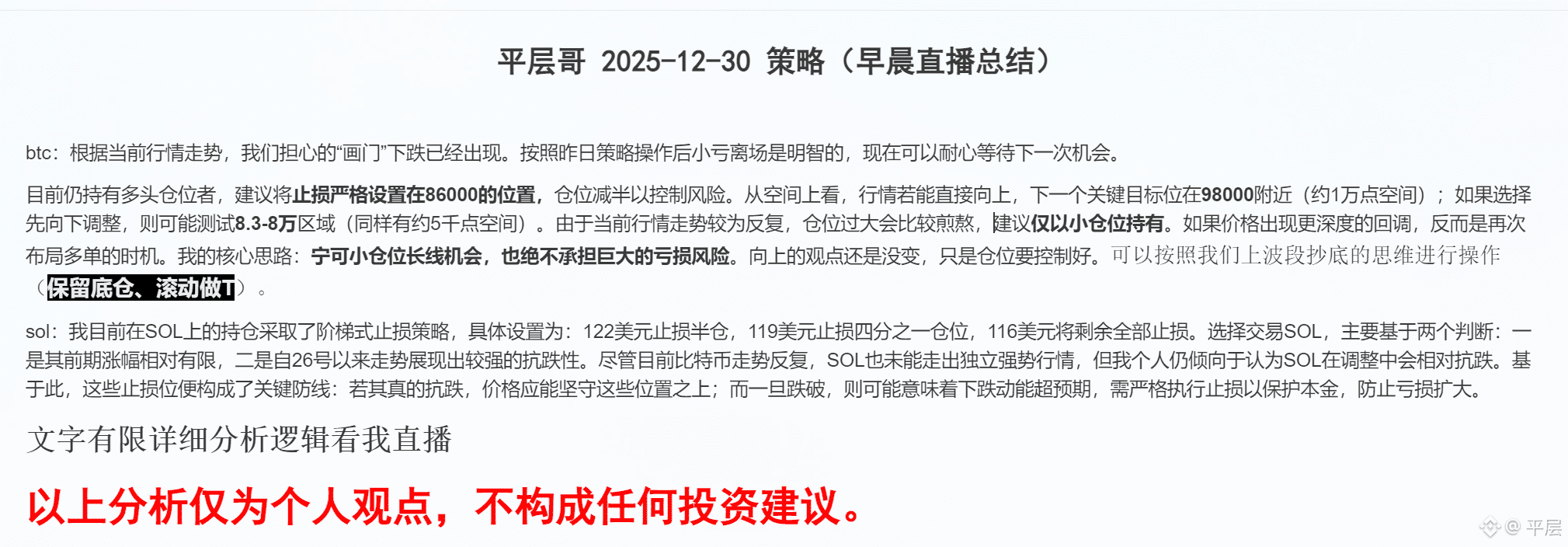 兄弟们好,平层哥这边来做一个近一个月的策略复盘。这轮行情经历了多次 "画门"洗盘、假突破诱空、圣诞假期缩量震荡,但我们始终坚持一个核心:看多不做空,严格止损,保留底仓滚动做T。