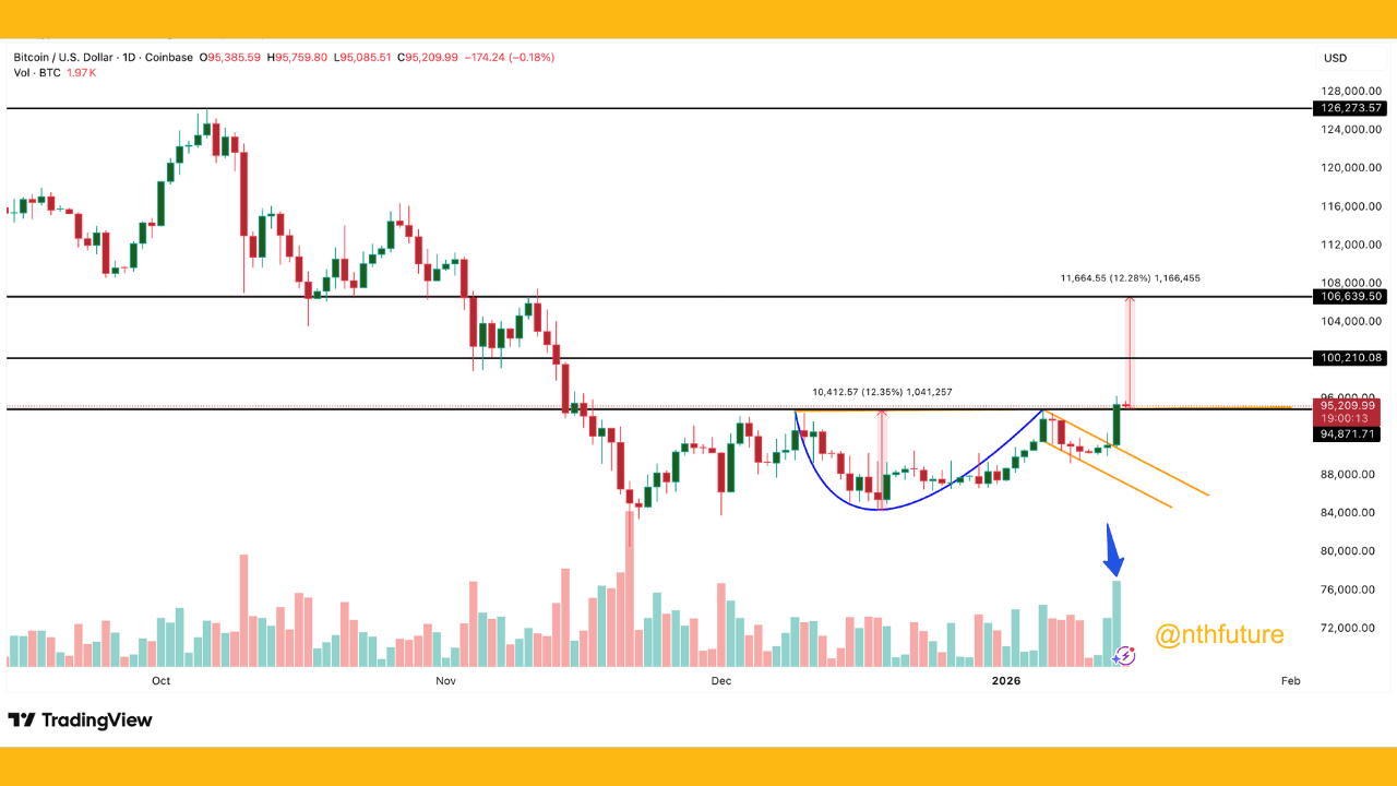 $BTC vłaśnie przełamała model cup-and-handle wokół 94 800 USD przy dużym obrocie. Jest to przełamanie z silnym popytem, a nie wynikający z niskiej płynności. Cel techniczny według modelu znajduje się wokół 106 600 USD, ale poziom psychologiczny 100 000 USD nadal stanowi istotne wyzwanie do osiągnięcia.