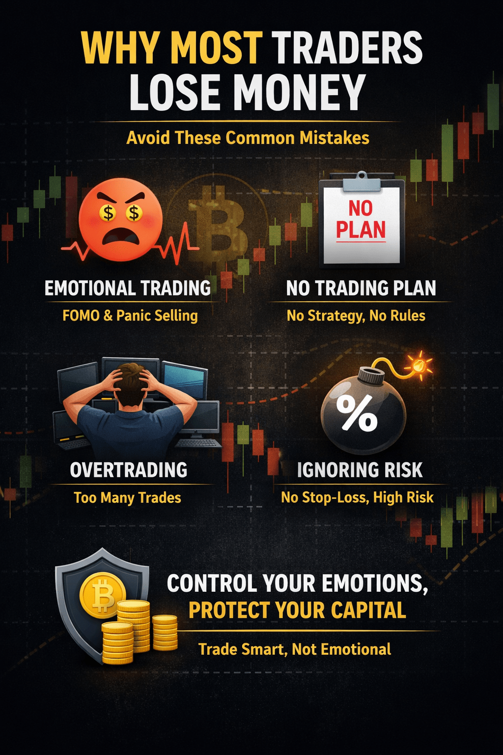 Rynek kryptowalut oferuje ogromne możliwości, ale rzeczywistością jest, że większość traderów traci pieniądze. Nie dzieje się tak dlatego, że rynek jest nieuczciwy — dzieje się z powodu błędów i emocji.