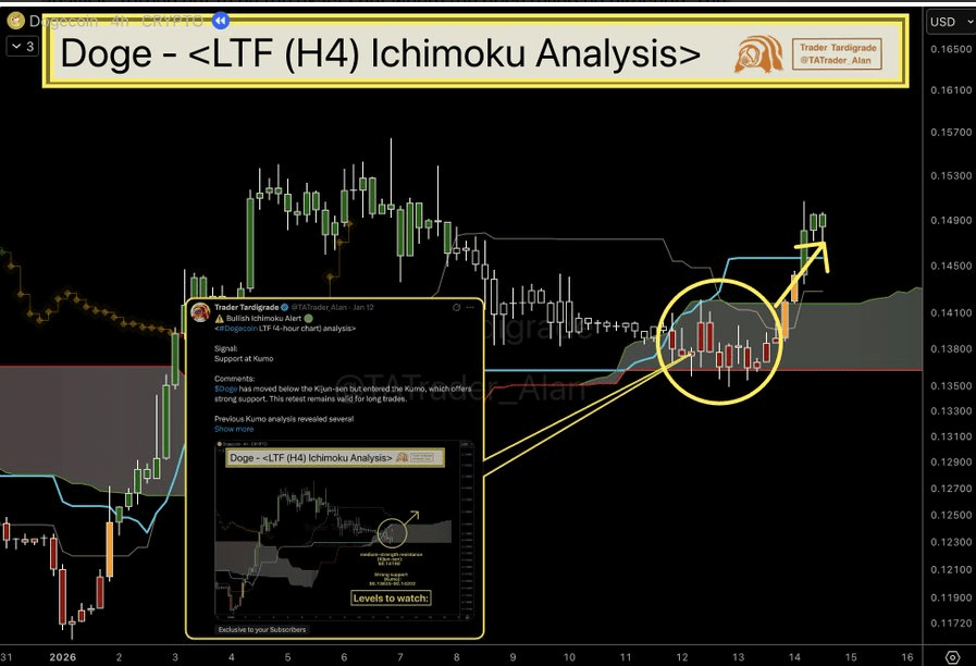 $DOGE Dogecoin mocno odbił się od poziomu wsparcia chmury Kumo na czasie 4-godzinnym, potwierdzając wzrostowy impuls poprzez analizę Ichimoku, która dokładnie przewidziała odwrócenie.