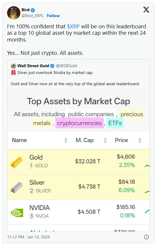 $XRP Bird (@Bird_XRPL), znana postać w społeczności kryptowalut, niedawno podzielił się odważnym przewidywaniem dotyczącym XRP. Stwierdził: „Jestem pewien na 100%, że $XRP wyłącznie na tym liderze jako jeden z 10 największych aktywów globalnych pod względem kapitalizacji rynkowej w ciągu najbliższych 24 miesięcy.” Dodał krótkie wyjaśnienie. „Nie tylko kryptowaluty. Wszystkie aktywa.”