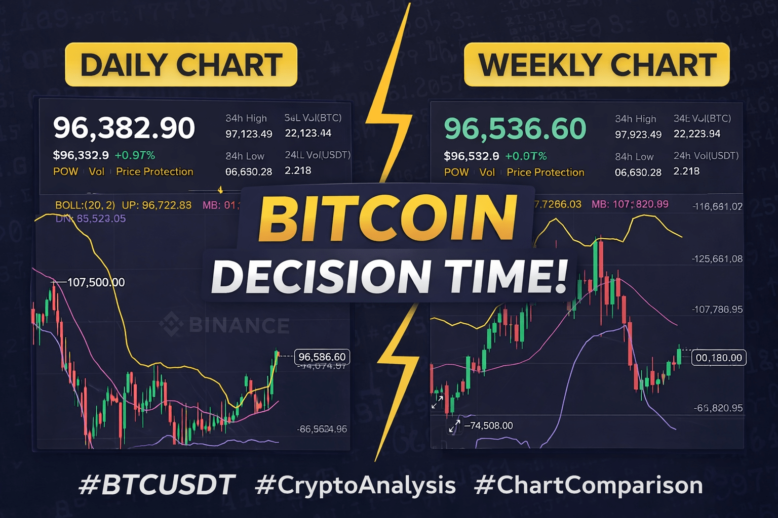Bitcoin (BTC/USDT) obecnie notuje w pobliżu poziomu 96 000 USDT, a rynek wysyła mieszane, ale ważne sygnały. Aby uniknąć zamieszania i emocjonalnej gry, konieczne jest przeanalizowanie wykresów tygodniowych i dziennych, ponieważ każdy czas ramowy pokazuje inną stronę rynku.
