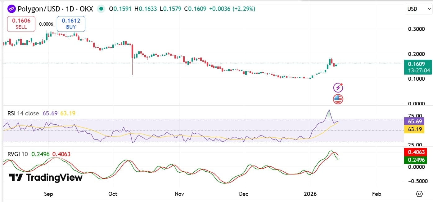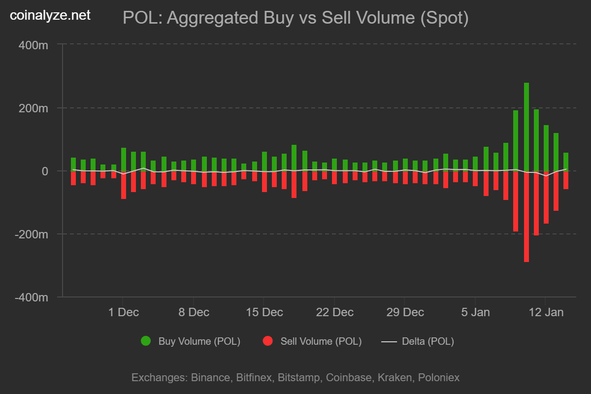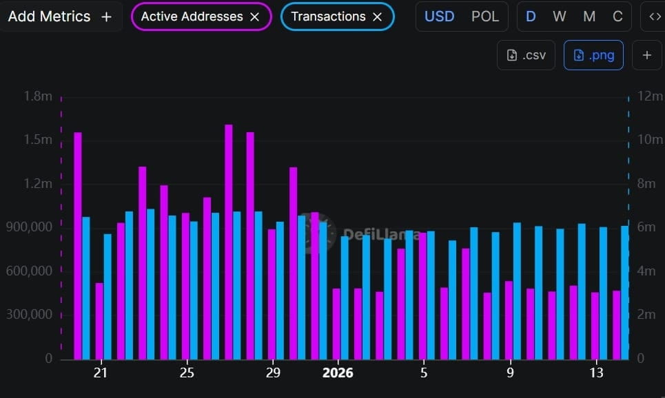 Według danych opublikowanych przez AMBCrypto, objętość transakcji Polygonu w 2025 roku osiągnęła rekordowy poziom, a całoroczna liczba transakcji wyniosła 1,4 miliarda. Po wejściu w 2026 rok aktywność sieci nadal utrzymuje się na wysokim poziomie, a ostatnie dwa tygodnie charakteryzowały się średnią dzienną objętością około 6 milionów transakcji.