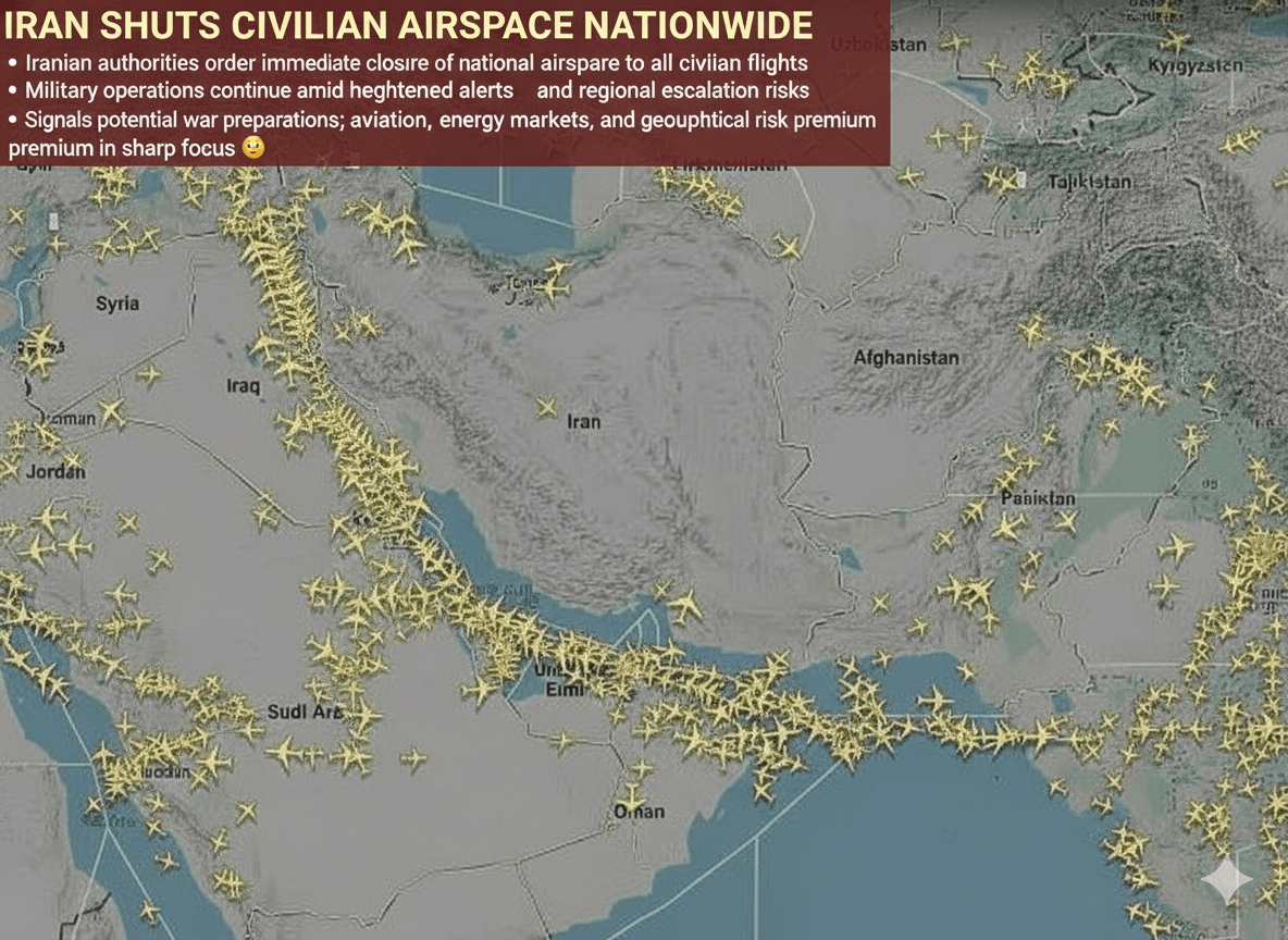 * Gotowość wojskowa: Teheran ostrzegł, że w przypadku ataku uderzy w bazy USA w Arabii Saudyjskiej, ZEA i Turcji. Zamknięcie przestrzeni powietrznej zmniejsza ryzyko błędnej identyfikacji (podobnie jak w 2020 roku, gdy zestrzelono lot PS752), jednocześnie torując drogę dla potencjalnych operacji rakietowych lub dronowych.