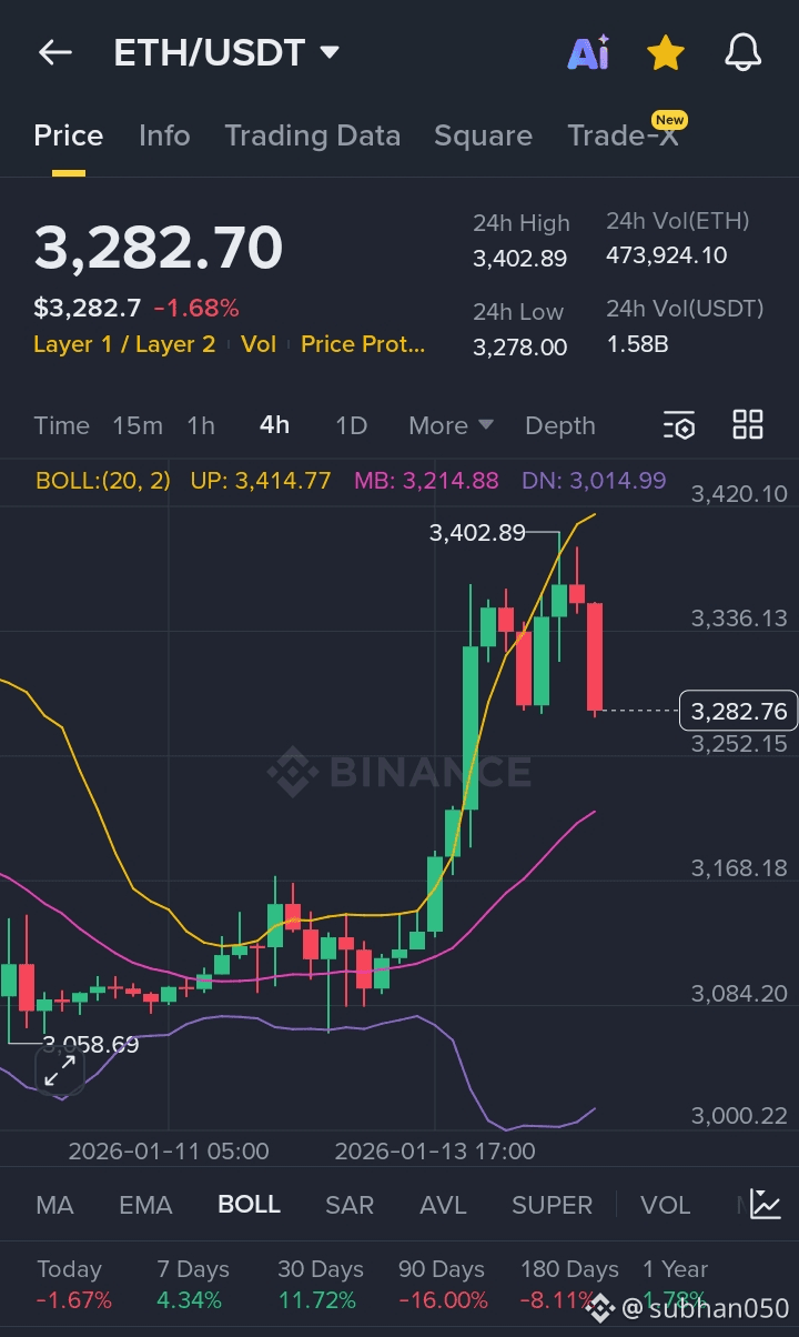 Ethereum has recently shown a strong upward move from the lower Bollinger Band on the 4-hour chart, which clearly indicates that buyers stepped in from a discounted zone. After this fast rally, price faced rejection near the upper Bollinger Band, showing that ETH became expensive in the short term and sellers started to appear. This type of pullback is normal after a strong move and should not be seen as weakness until key support levels are broken with a confirmed candle close.