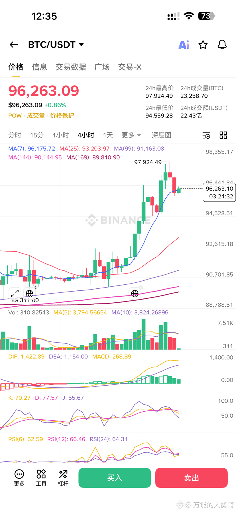 * 右侧确认位(稳健型): 等待 1 小时级别重新站稳 96,800(即收复 1 小时 MA7 均线),代表短线回调结束,目标直指 100,000。