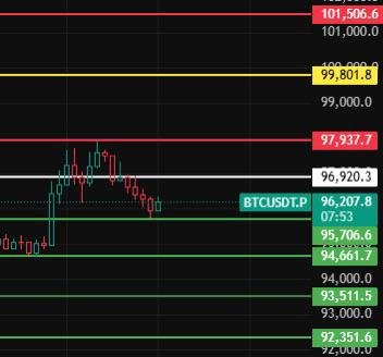 BTC dzisiaj zwróć uwagę na 96920, tak długo jak zamknięcie będzie powyżej tej wartości, ta korekta 1-2 godzinowa się kończy, a rynek znów będzie szedł w górę. Zwróć uwagę na poziomy oporu w pobliżu 97940-99800-101500!