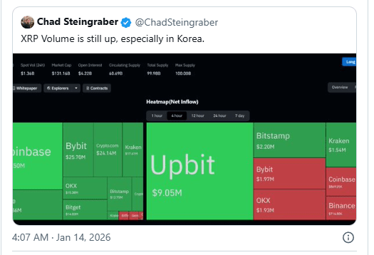 Analiza Steingrabra podkreśla wyjątkowo wysoką aktywność handlową jako kluczowy wskaźnik pozytywnej nastrojów rynkowych. Zauważalnie, wybrzeże Upbit w Korei Południowej odpowiedzialne było za 87,75 mln dolarów objętości XRP, co stanowi ponad 20% globalnych transakcji na rynku gotówkowym. Skoncentrowana aktywność regionalna często wskazuje na silny lokalny popyt, który może działać jako katalizator dla szerszego ruchu rynkowego.