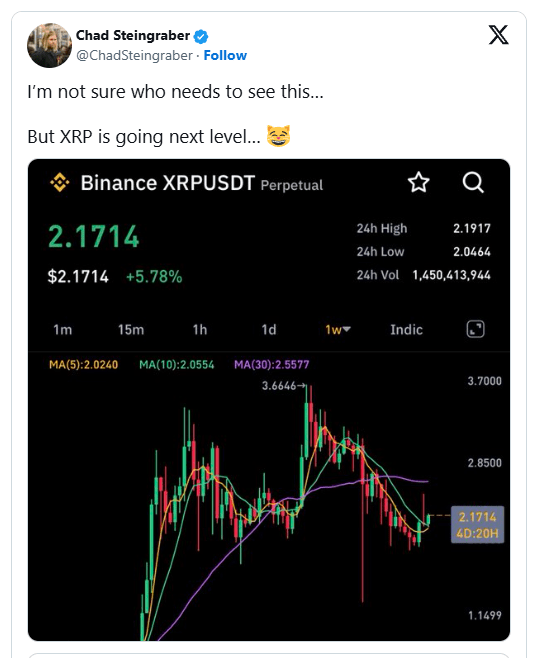 W ostatnim poście na X, analityk kryptowalut Chad Steingraber podkreślił rozwijający się pozytywny wygląd XRP, zwracając uwagę zarówno na ruch ceny, jak i aktywność obrotową. Zauważył, że XRP niedawno wzrosł do 2,17 USD na kontraktach terminowych Binance, zanotowując wzrost o 5,78% w ciągu 24 godzin i wspierany objętością obrotów na poziomie 1,45 miliarda dolarów na całym świecie.