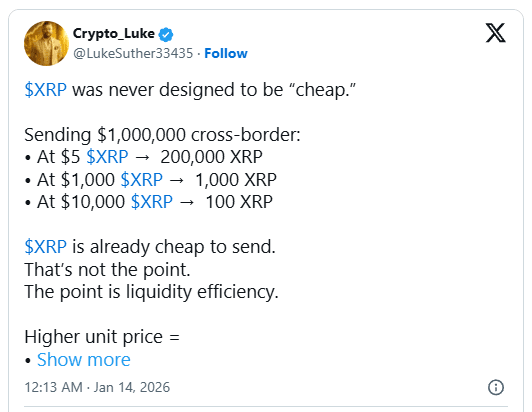 Wnioski Crypto_Luke’a wyzwalają powszechną koncepcję „tańszych” tokenów. Wartość XRP wynika z efektywności płynności, redukcji ryzyka i wydajności w skali, a nie z nominalnej ceny tokena.