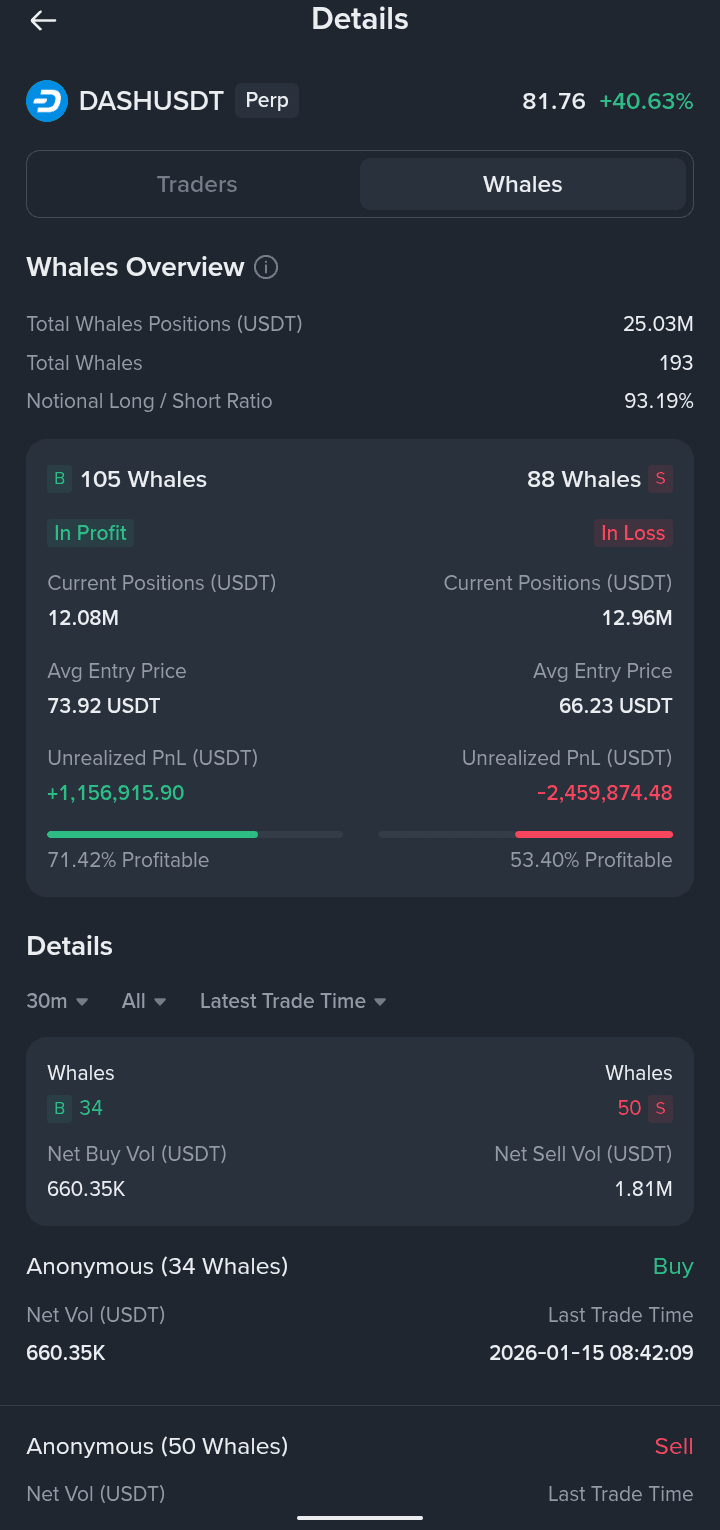 DASHUSDT wzrosł o ok. 40%, notowany w okolicach 81–82. Momentum jest silne, ale to już nie wczesne etapy.