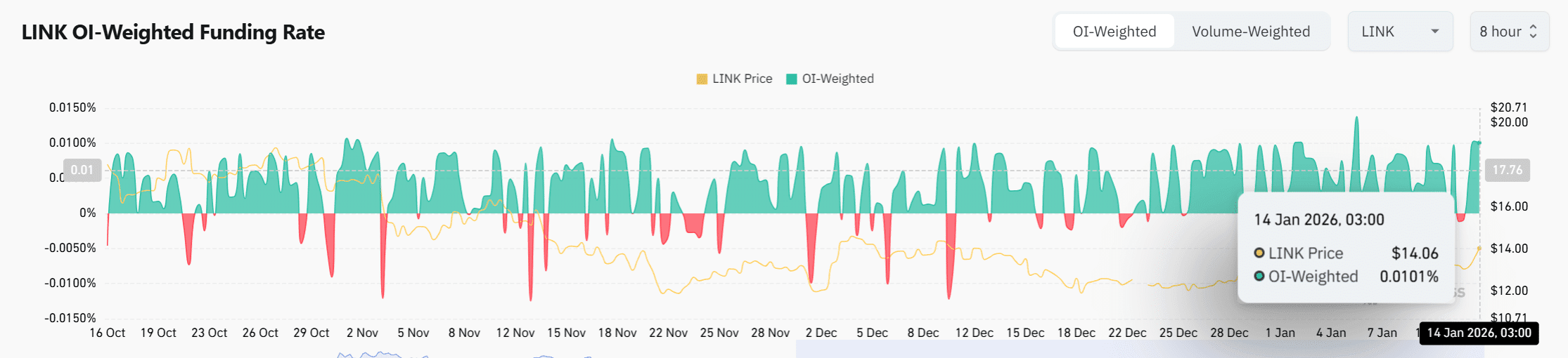 Ważność finansowania ważona OI Chainlink przeszła na wartość dodatnią, około 0,0101%, co wskazuje, że byki są skłonne płacić za utrzymanie pozycji. Oznacza to, że traderzy utrzymują pewność co do wzrostu cen, a jednocześnie skala kapitału pozostaje kontrolowana, bez agresywnej spekulacji.