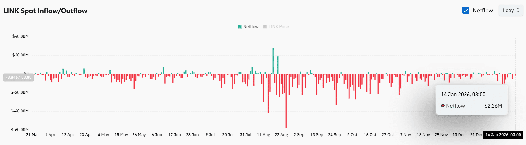 Dane giełdowe również wspierają to strukturalne przełamanie. Ostatnio Chainlink odnotował odpływ kapitału w wysokości około 2.260.000 dolarów, co pokazuje, że ten ciągły odpływ łagodzi presję sprzedażową, a nie jest paniką sprzedażową. Odpływ kapitału zmniejszył podaż w czasie korekty, co ułatwiło kupującym obronę poziomów cenowych.