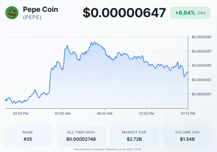 W momencie pisania, cena handlowa PEPE wynosi 0.00000647 dolarów, a w ciągu ostatnich 24 godzin wzrosła o 6.84%.