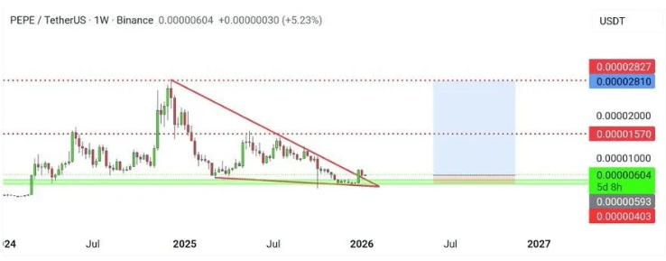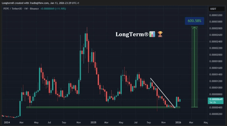 Według analityka 𝐋𝐨𝐧𝐠𝐓𝐞𝐫𝐦, struktura tygodniowa sugeruje, że PEPE wydaje się gotowy na kolejny wzrost. Wykres pokazuje, że cena przed przebiciem i stabilizacją w kluczowym długoterminowym obszarze wsparcia w pobliżu 0.0000058 dolarów do 0.0000060 dolarów, najpierw zwęziła się do zstępującego klina. Obszar ten był tradycyjnie miejscem wsparcia ze strony popytu, a ostatnia odbicie wskazuje, że sprzedający zdołali wchłonąć presję sprzedaży, przygotowując grunt pod nową falę wzrostu.