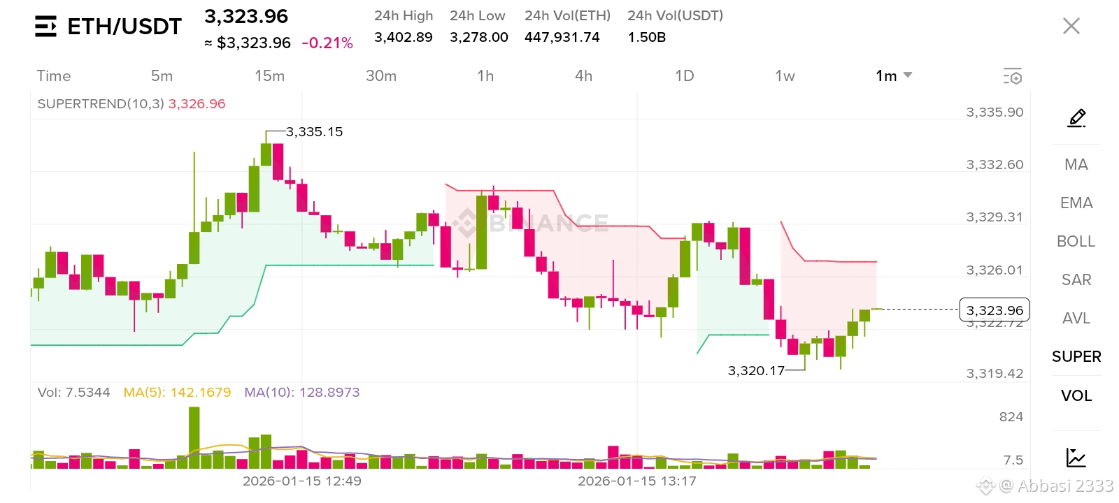 Ethereum $ETH (ETH) is currently trading near $3,324, showing signs of a mild recovery after facing selling pressure earlier in the session. The price recently dropped toward the $3,320 support zone before buyers stepped in, creating a small bounce.