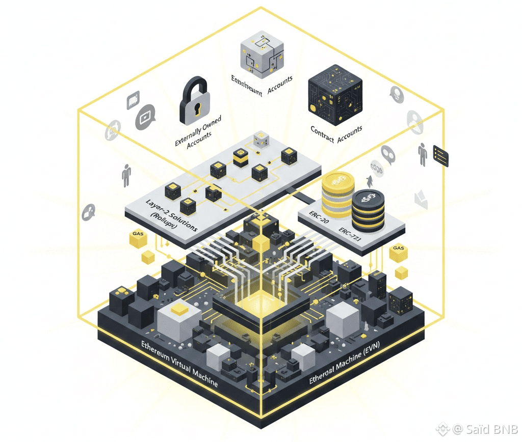At its foundation is the Ethereum Virtual Machine (EVM), a global computational engine that executes smart contracts deterministically across all nodes in the network. Users interact with Ethereum through accounts — either externally owned accounts (controlled by private keys) or contract accounts (which contain code and state).