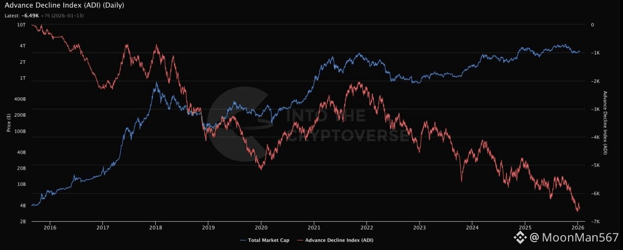 Індикатор Advance–Decline Index (ADI) по топ-100 альткоїнам показує просту річ: