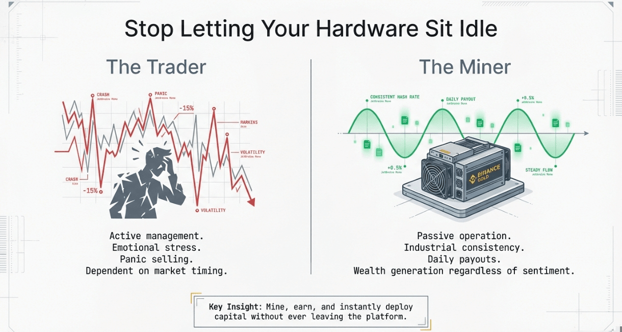 Łącząc surową moc sprzętu z narzędziami finansowymi giełdy Binance, tworzysz kompletny ekosystem: Wydobywaj aktywa, oszczędzaj je dla zysku, a handluj nimi dla zysku.