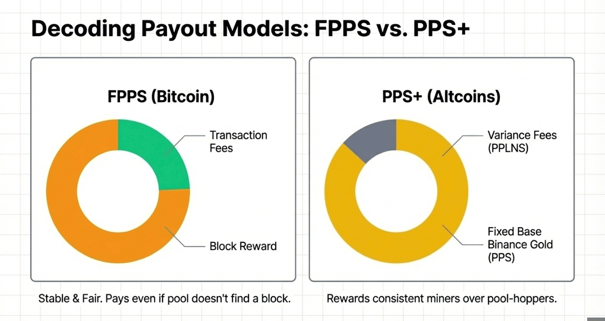 FPPS (Full Pay-Per-Share) - Używane dla BTC: Otrzymujesz wynagrodzenie za każdy ważny udział, który przesyłasz. Obejmuje to nagrodę za blok oraz opłaty transakcyjne. To jest najbardziej stabilna i "sprawiedliwa" metoda wydobywania Bitcoina, ponieważ nie musisz czekać, aż pula będzie miała "szczęście" i znajdzie blok; Binance płaci ci natychmiast za twoją pracę.