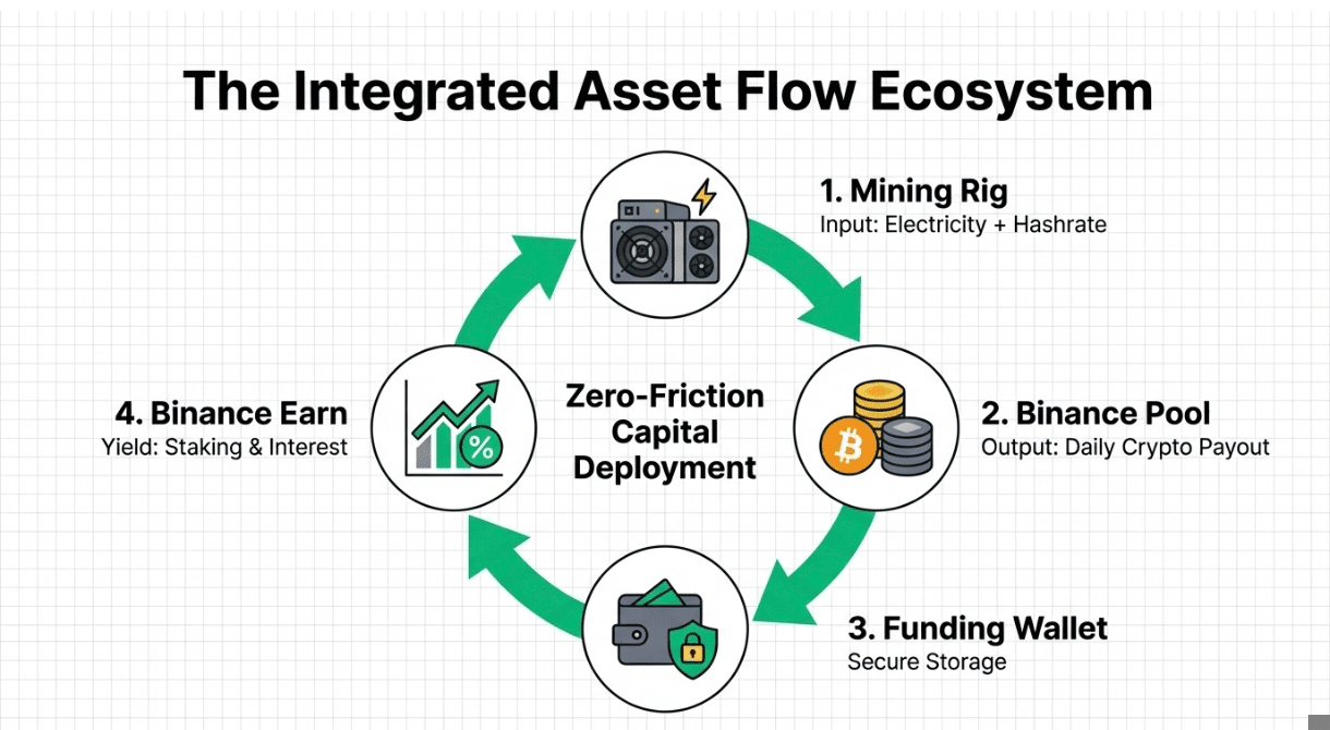 Integracja ekosystemu: Przychody przepływają bezpośrednio do twojego Portfela Finansowego Binance. Stamtąd mogą być przeniesione do Binance Earn, aby natychmiast generować odsetki na twoich przychodach z wydobycia.