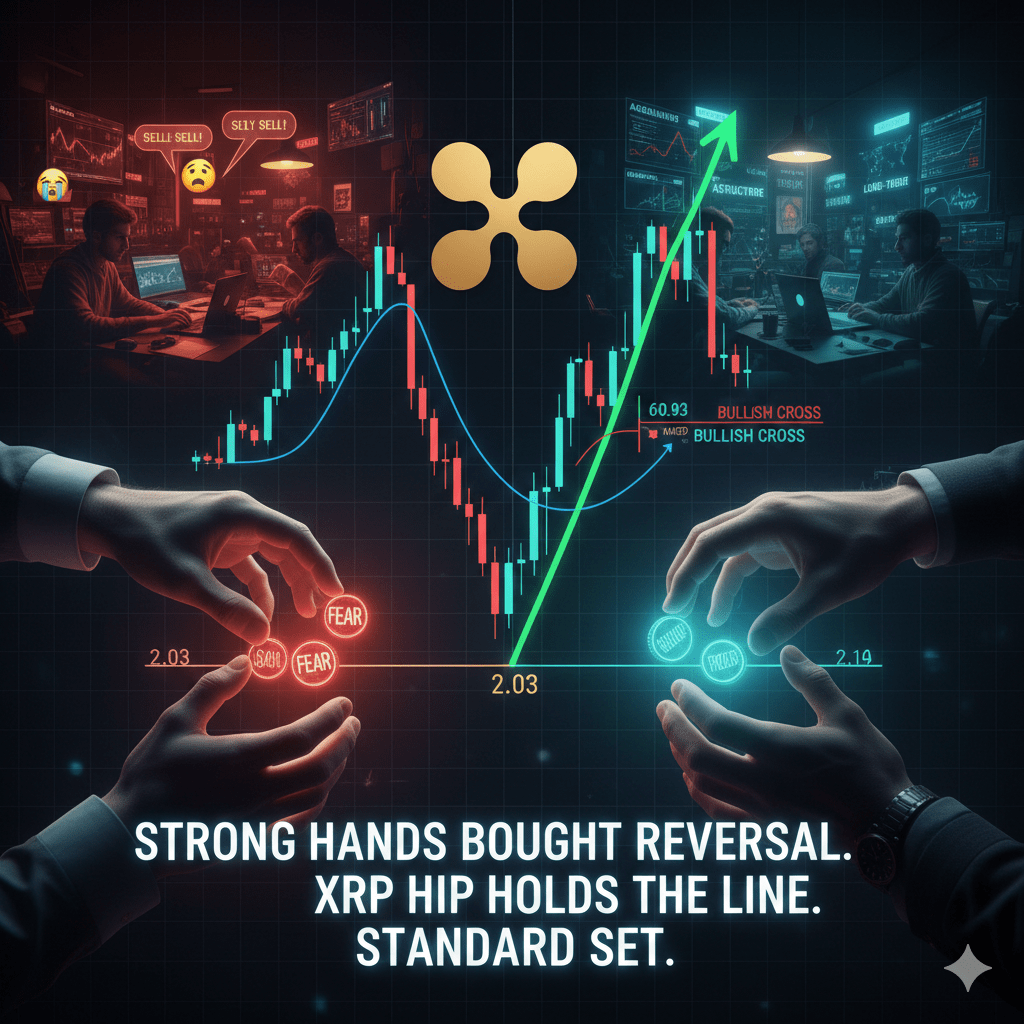 Po silnym pchnięciu w kierunku 2,19 dolarów akcje cenowe stały się agresywne. XRP został wyrzucony dwukrotnie w kierunku strefy wsparcia 2,03 dolarów, wywołując strach, polowanie na zatrzymanie strat i emocjonalne sprzedanie. Nie było to przypadkowe. Było zaplanowane w celu wywołania kapitulacji i przekazania dostępu z słabych rąk do silnych.