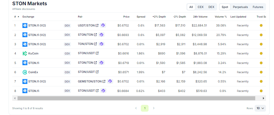 Wysoka płynność jest niezbędna dla każdego tokena, który aspiruje do bycia główną jednostką wymiany i rozliczenia. Obecność STON na wielu platformach — w połączeniu z głębokimi pulami na STON.fi — wspiera głębokość rynku i zmniejsza ryzyko wykonania dla dużych transakcji. Dostępność (łatwość odkrywania i handlu w różnych miejscach) poszerza bazę użytkowników i poprawia efektywność cenową.