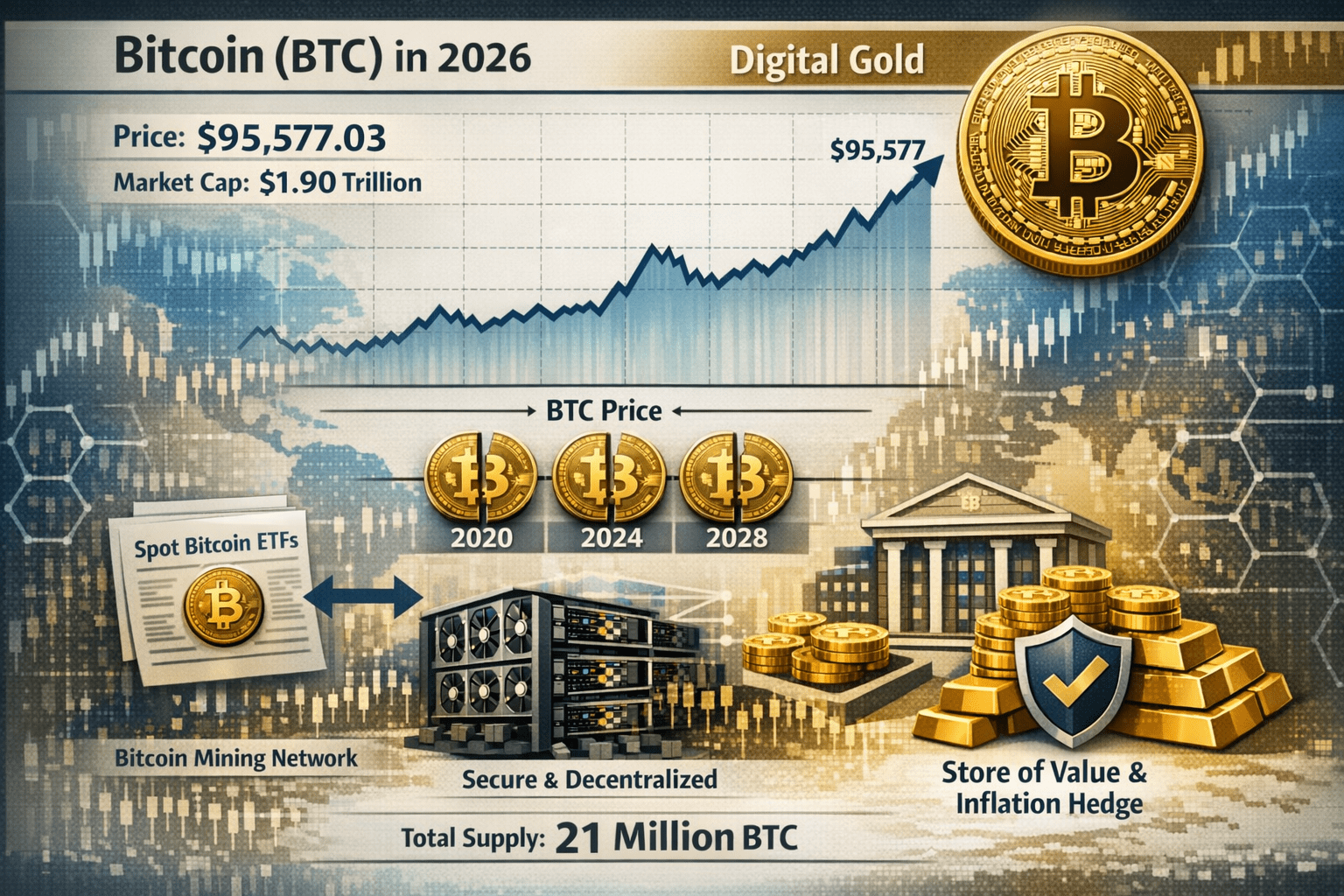 $BTC Bitcoin (BTC) pozostaje najbardziej znaczącą i wpływową kryptowalutą w 2026 roku, często nazywaną "złotem cyfrowym" ze względu na ściśle ograniczoną podaż 21 milionów monet. Na dzień 16 stycznia 2026 roku utrzymuje dominację na rynku, z ceną wahającą się wokół 95 577,03 USD, co odpowiada kapitalizacji rynkowej bliskiej 1,90 biliona USD. Ta wartość jest podtrzymywana przez jej zdecentralizowaną naturę oraz mechanizm halvingu, który występuje co cztery lata i zmniejsza tempo emisji nowych monet, zapewniając rzadkość. Przyjęcie instytucjonalne osiągnęło nowe szczyty, z funduszami ETF typu Spot Bitcoin i skarbniami korporacyjnymi trzymającymi istotne części obiegowej podaży. Choć jego cena może być wrażliwa na wahania, wielu inwestorów wykorzystuje ją jako długoterminowy hedges przeciw inflacji i główny środek przechowywania wartości. Jej bezpieczeństwo zapewnia globalna sieć górników, którzy wykorzystują ogromne zasoby obliczeniowe do weryfikacji transakcji na publicznej, niezmiennej liście. Jako pierwszy i największy aktyw cyfrowy, Bitcoin nadal ustala ton dla całego rynku kryptowalut, wpływając na wydajność prawie wszystkich innych monet. #BTC #CryptoMarkets #btc70k