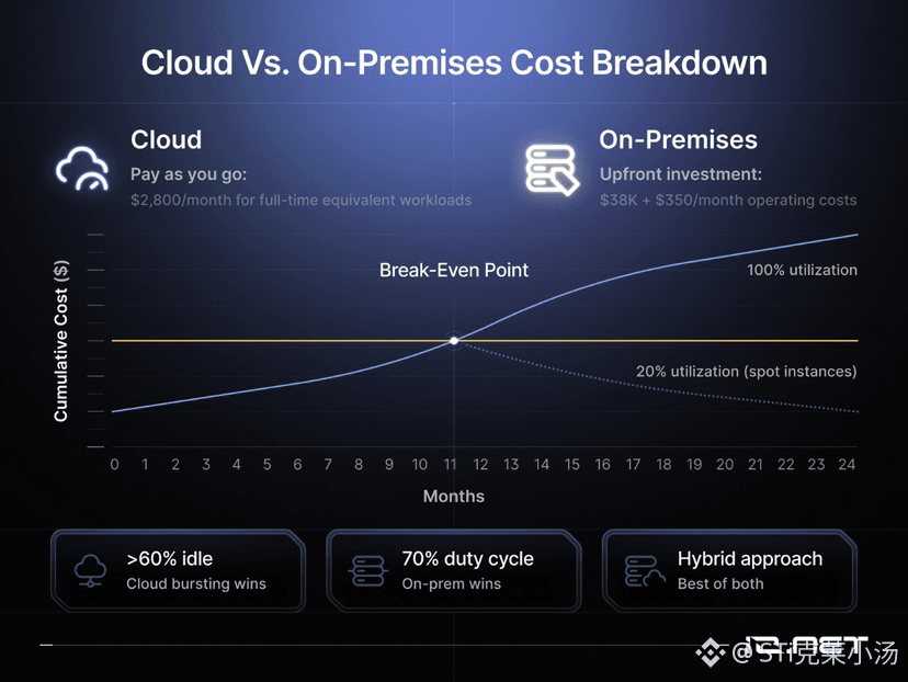 本地部署的盈亏平衡点为 14 个月,但这仅在设备保持 24/7 全天候运行 的前提下成立。如果工作负载的运行时间仅占 20%,采用 云端竞价实例(Spot Instances) 具有更优的资本支出(Capex)效益。