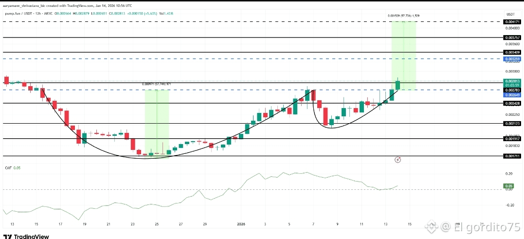 #pump se negocia cerca de 0.00281 dólares, lo que refleja un sentimiento de corto plazo más positivo. La estructura técnica suma al panorama alcista. #pump está rompiendo una figura de “taza y asa” en el gráfico de 12 horas, lo que suele señalar continuación.