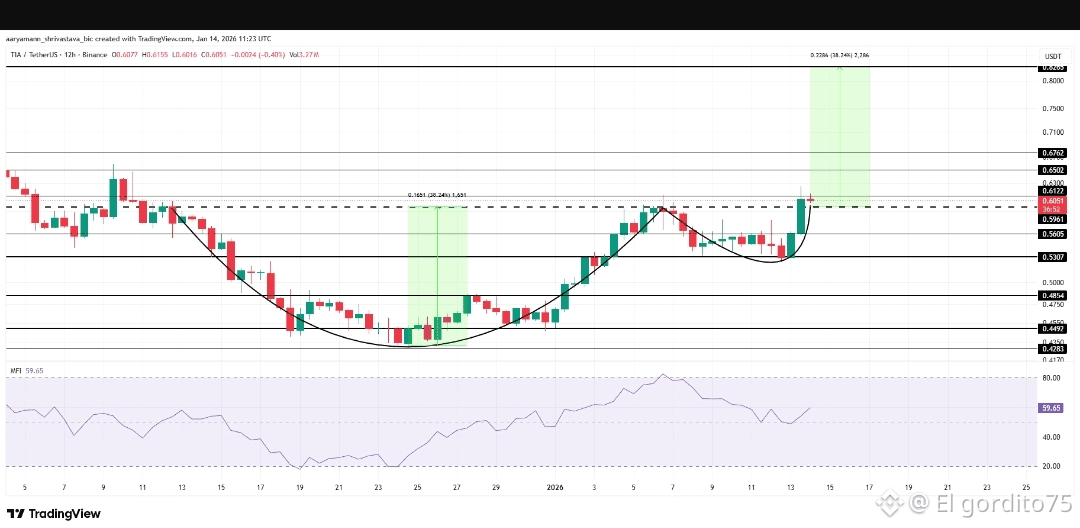 Los indicadores de momentum apoyan esta perspectiva. El Money Flow Index se está recuperando desde el nivel neutral, mostrando una presión de compra creciente. Si las entradas se mantienen, #tia A podría superar los 0.65 y 0.67 dólares. Convertir esos niveles en soporte confirmaría la ruptura alcista y reforzaría el potencial de subida a corto plazo.