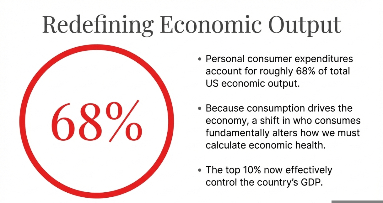 This shift has profound implications for how we calculate economic health. Since personal consumer expenditures account for roughly 68% of total US economic output, the top 10% now effectively control the country's GDP.
