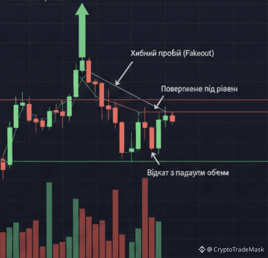 • Під час ретесту (відкату): Об'єм має зменшуватися. Це показує, що продавці не зацікавлені тиснути ціну нижче, а відкат — це лише технічна корекція.
