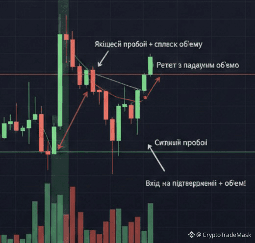 • Під час пробою: Об'єм має бути значно вищим за середній. Це свідчить про інтерес «розумних грошей».