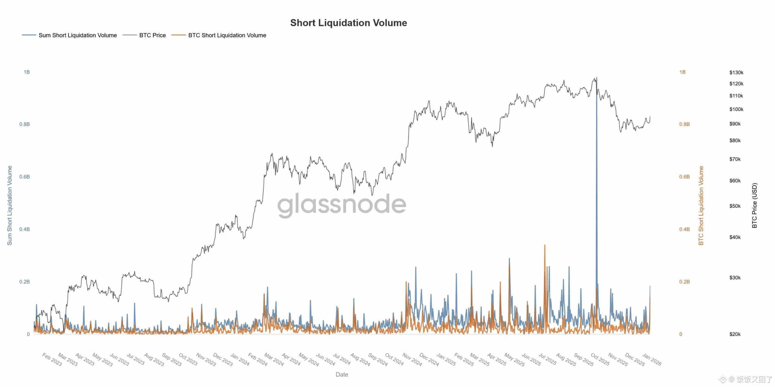 根据 Glassnode 的统计,这是自 2025 年 10 月以来,前 500 大加密资产中规模最大的一次卖空清算事件。清算高峰几乎与比特币刷新阶段性高点完全重合,说明这波上涨更多是被“强制回购”推上去的,而不是自然走出来的趋势。#BTC