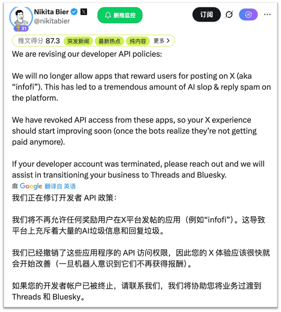 Oficjalne konto Twittera ogłosiło w nocy rewizję polityki API, co nie tylko spowodowało spadek cen projektów InfoFi, takich jak Kaito i Cookie, o ponad 20%, ale także rzuciło bombę w kręgu ludzi zajmujących się zbieraniem pieniędzy. Od dłuższego czasu projekty zarabiające na informacji przyzwyczaiły się do pozyskiwania tanich chipów na X poprzez 'socjalne wydobywanie', ale ta zależność od innych w modelu 'dzikiego wzrostu' w końcu zderzyła się z twardą rzeczywistością scentralizowanej platformy.