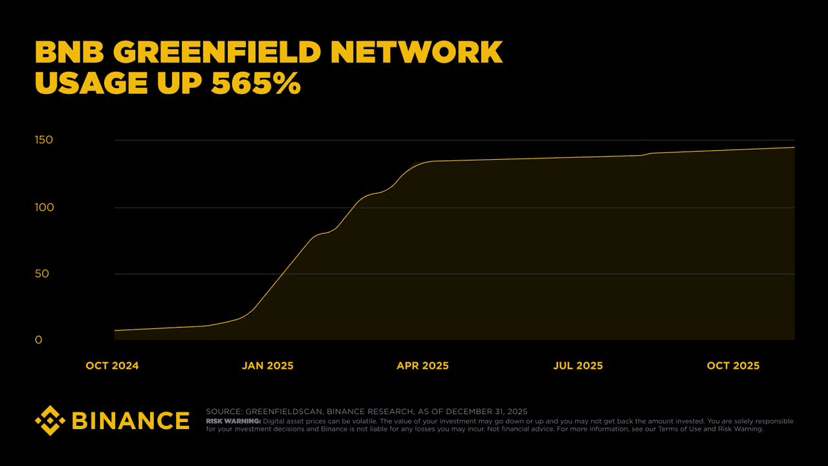 Wyróżniającym się graczem w ekosystemie był BNB Greenfield. Zdecentralizowana sieć pamięci odnotowała wzrost użycia o 565% w 2025 roku. Ten wzrost był głównie napędzany przez przecięcie AI i blockchain, ponieważ deweloperzy szukali zdecentralizowanych, odpornych na cenzurę sposobów przechowywania ogromnych zbiorów danych dla modeli uczenia maszynowego.
