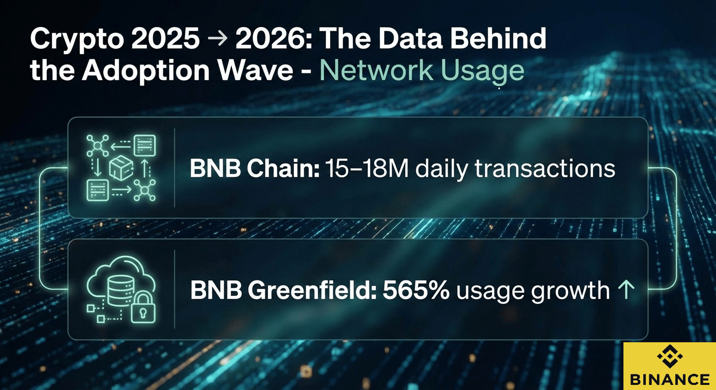 BNB Chain przetworzył 15–18 milionów codziennych transakcji, co pokazuje dużą skalę rzeczywistego użycia, podczas gdy BNB Greenfield odnotował 565% wzrost aktywności zdecentralizowanej sieci danych.