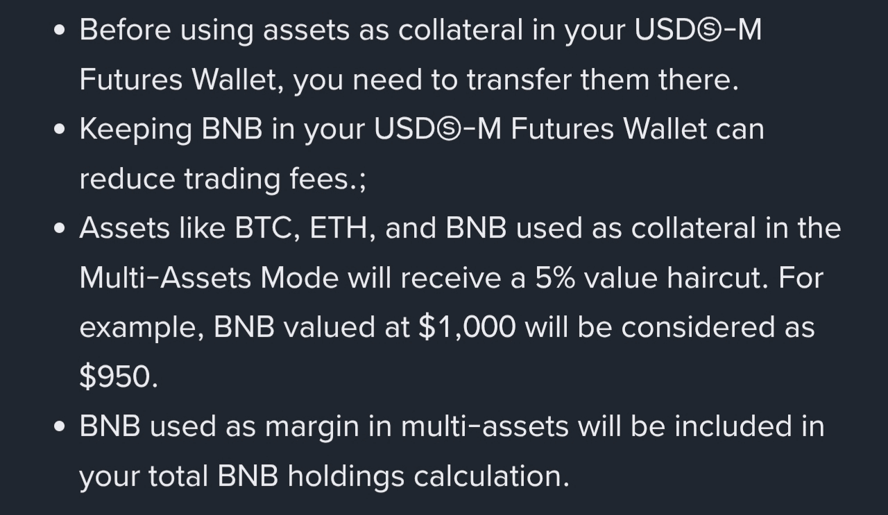 - Move them to Futures Wallet: Transfer your holdings over to the Futures Wallet before using them as backup. Pro tip: Stash some BNB there to slash trading fees by up to 10% (Binance's got your back). Heads up, though – there's a 5% haircut on these (like $1,000 BNB counting as $950 collateral), but it's worth it for the rock-solid base it gives your futures plays.