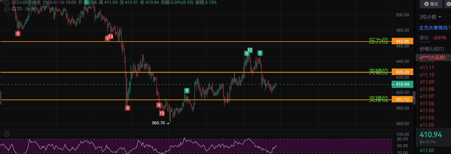 Indeks strachu i chciwości spadł do 49 punktów, rynek nagle przeszedł z 'chciwości' do 'neutralności'. Na pierwszy rzut oka wydaje się, że emocje słabną, ale właściciel miasta zauważył: to dokładnie dobry moment na oczyszczenie rynku przez głównych graczy! ZEC obecnie 410 dolarów, 426 dolarów to kluczowy poziom oporu, 391 dolarów to mocne wsparcie. Dziś wielokrotnie próbowano uderzyć w 415 dolarów, ale bezskutecznie; wydaje się słabe, ale w rzeczywistości główni gracze 'testują presję sprzedaży' — jak bokser, który przed zainkasowaniem ciosu wprowadza przeciwnika w błąd, by zmusić drobnych graczy do oddania tanich akcji!