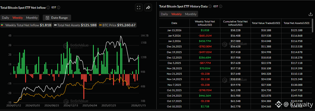 كان ارتفاع سعر البيتكوين هذا الأسبوع مدعومًا بزيادة الطلب المؤسسي. يظهر الرسم البياني SoSoValue أدناه أن صناديق الاستثمار المتداولة في البيتكوين سجلت صافي تدفق داخلي قدره 1.81 مليار دولار حتى يوم الخميس، وهو أعلى تدفق أسبوعي منذ أوائل أكتوبر، عندما وصل البيتكوين إلى أعلى مستوى له على الإطلاق عند 126,199 دولار. إذا استمرت هذه التدفقات وتكثفت، فقد يرتفع البيتكوين نحو المستوى النفسي 100,000 دولار.