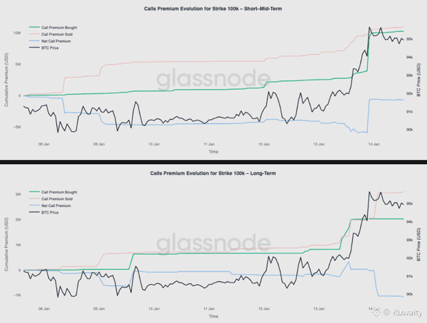 يوضح الرسم البياني من Glassnode أدناه تدفقات الخيارات حول مستوى 100 ألف دولار، مما يشير إلى أن المتداولين زادوا من شراء خيارات الشراء بينما استقرت أنشطة بيع الخيارات. هذا يدفع علاوات الشراء إلى الارتفاع، مما يظهر طلبًا قويًا على التعرض الصعودي على المدى القريب.