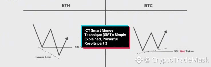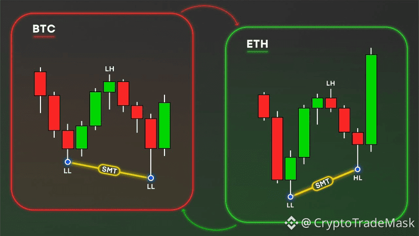 SMT виникає тоді, коли ця кореляція порушується. Це свідчить про те, що один із активів є сильнішим або слабшим за інший через накопичення або розподіл позицій великим капіталом.