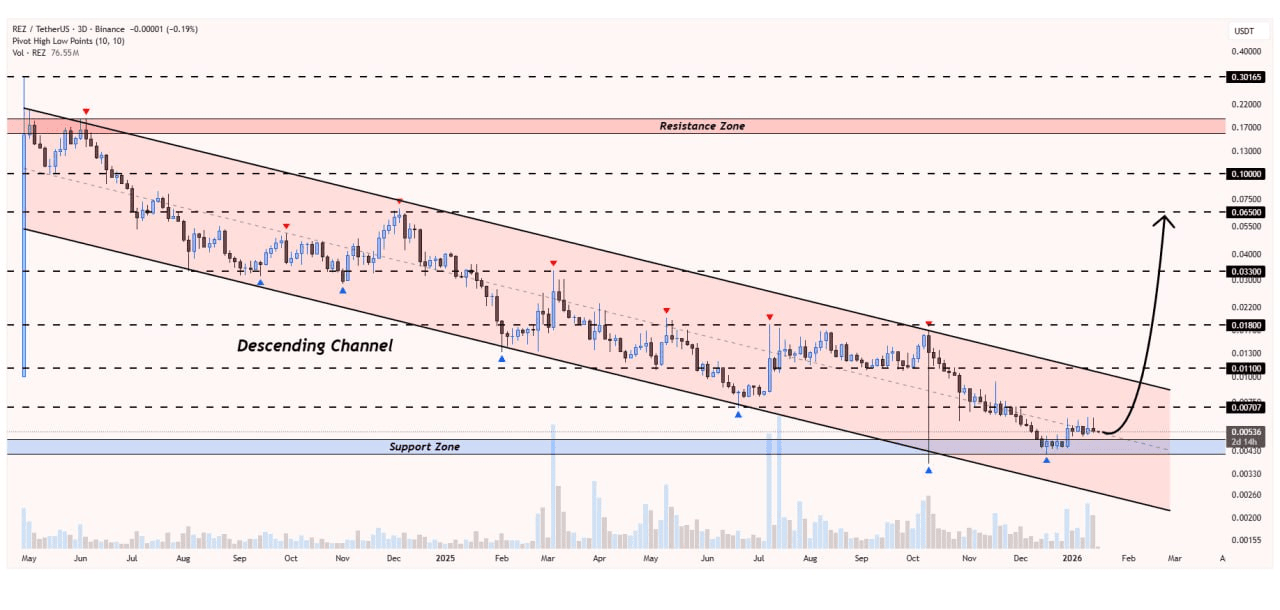 "Cześć wszystkim! Patrząc na $REZ chart w 3-dniowym przedziale czasowym, zauważyłem klasyczny wzór Zstępującego Kanału, który zasługuje na naszą uwagę. 📉➡️📈