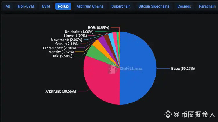 数据更残酷:Base TVL从31亿美元涨至56亿,占据L2赛道50%份额。Arbitrum死守30%但增长停滞。剩下的几十条L2,在空投发完后基本沦为鬼城。