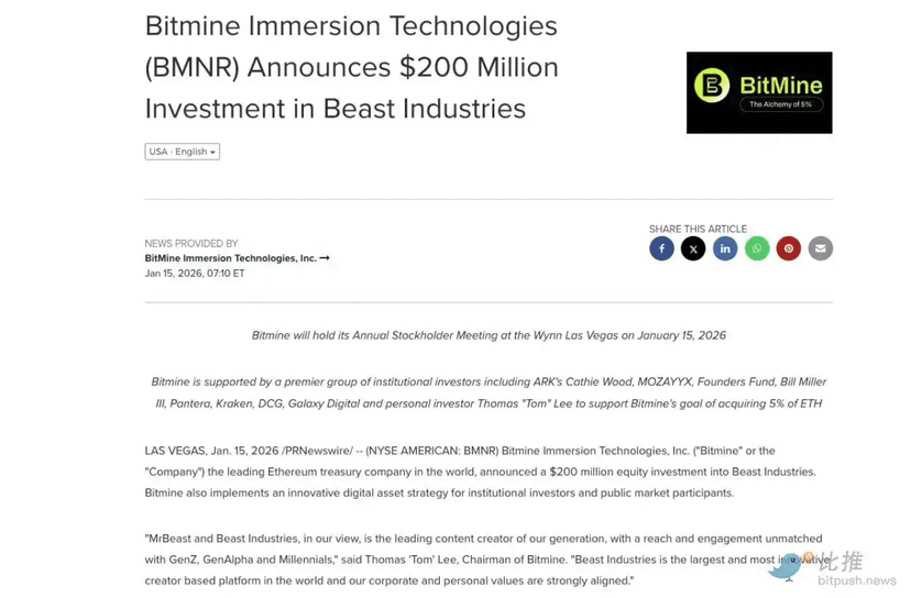 BitMine Immersion Technologies (BMNR), pod przewodnictwem znanego analityka z Wall Street Toma Lee, ogłosiła inwestycję w nabycie udziału w firmie holdingowej stojącej za największą globalną firmą wiodącą w transmisji MrBeast, znaną jako Beast Industries. Jednocześnie, Beast Industries w oficjalnym oświadczeniu zaznaczyło, że firma będzie badać, jak "zintegrować DeFi w nadchodzącej platformie usług finansowych".