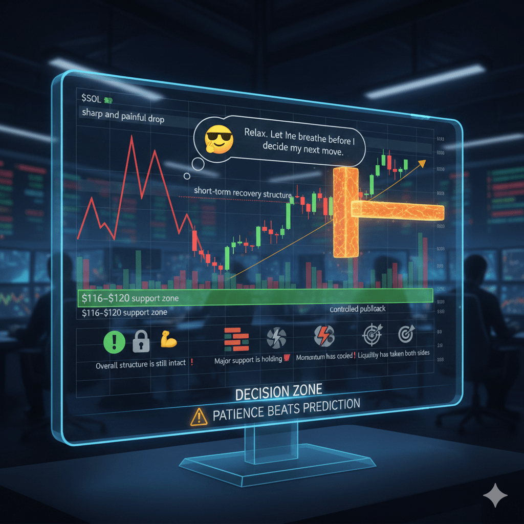 Po ostrym i bolesnym spadku, $SOL w końcu znalazł swoje miejsce wokół strefy wsparcia $116–$120. To nie było przypadkowe. To był poziom, na którym kupujący wkroczyli z pewnością 💪, mówiąc: „Dość to dość.”